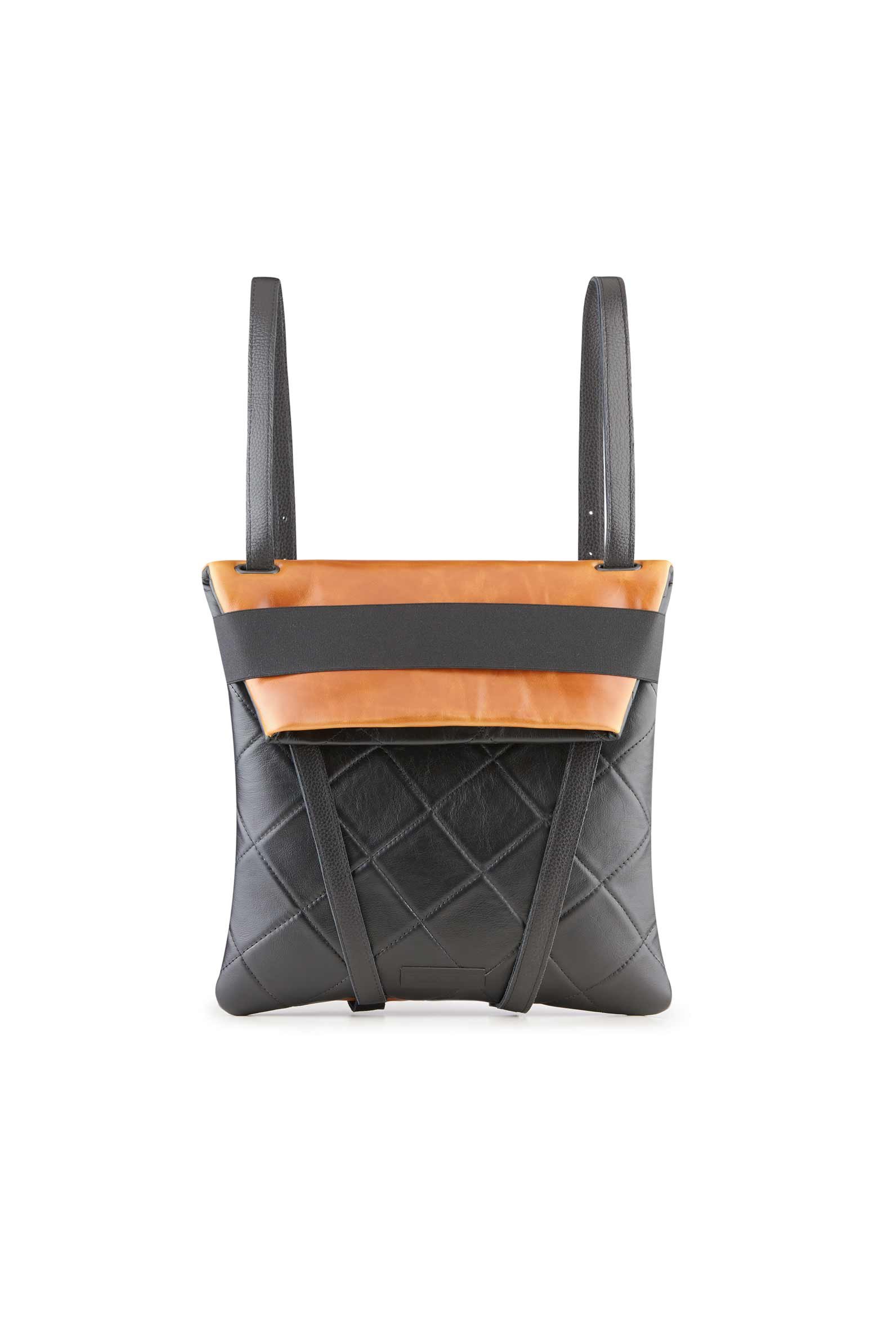 13-inch laptop backpack in black leather. Back in camel brown leather. Upcycled black elastic from the waste of polyester and cotton. and adjustable straps 70cm – 80cm. Two inner pockets. Dimensions:  35 x 33 cm. With an extra handle strap. REF MMBPCT Made in Portugal