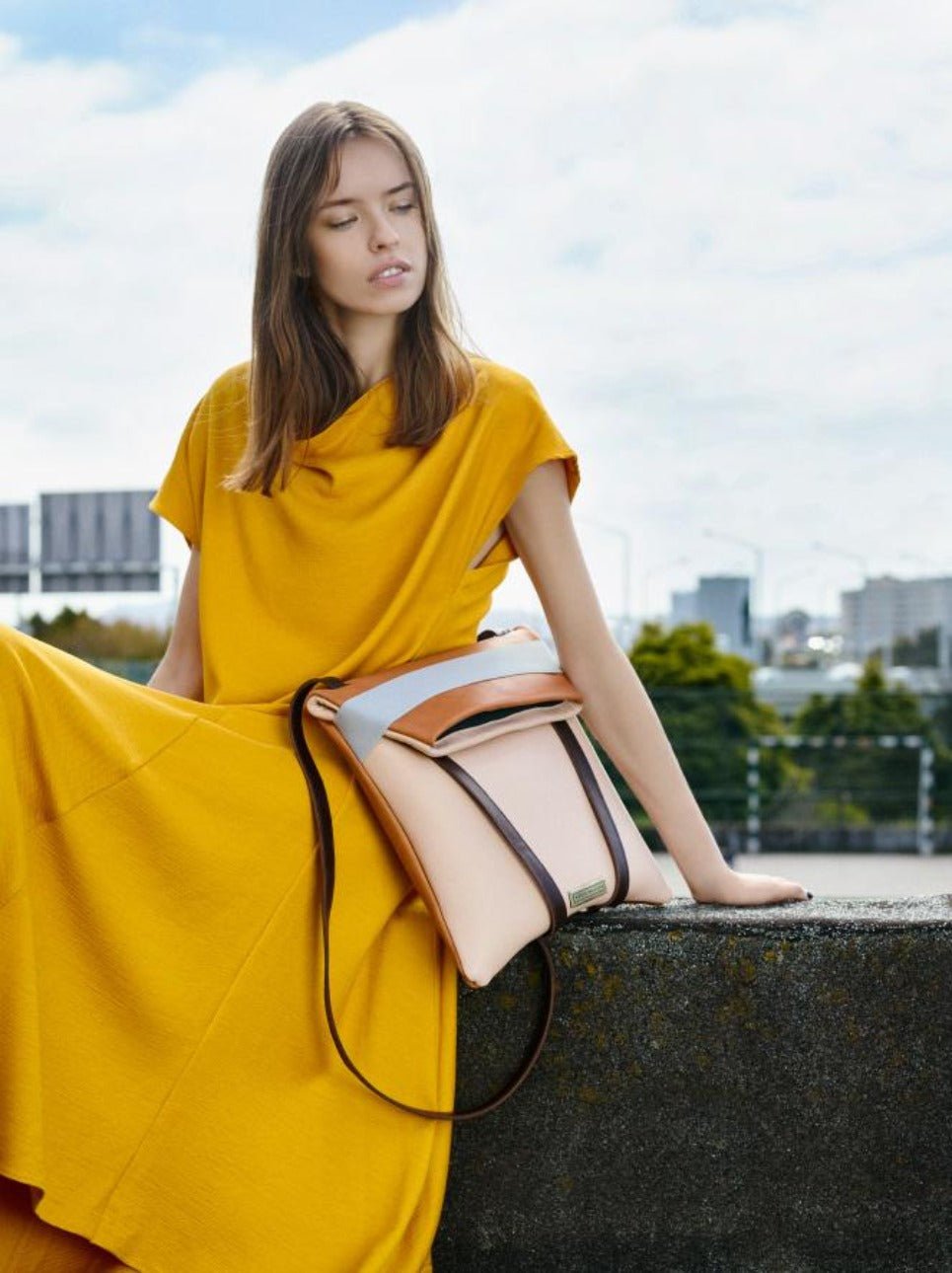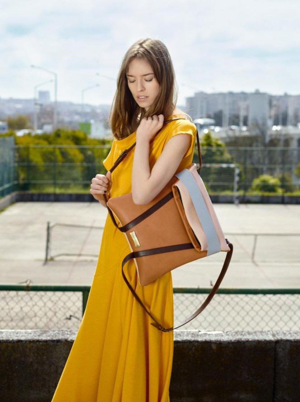 Slim laptop backpack in leather. Brown leather and Back in soft. pale pink color. Grey elastic and adjustable straps 70cm – 80cm. Two inner pockets. Dimensions:  35 x 33 cm. With an extra handle strap. REF. MMBPSD Made in Portugal