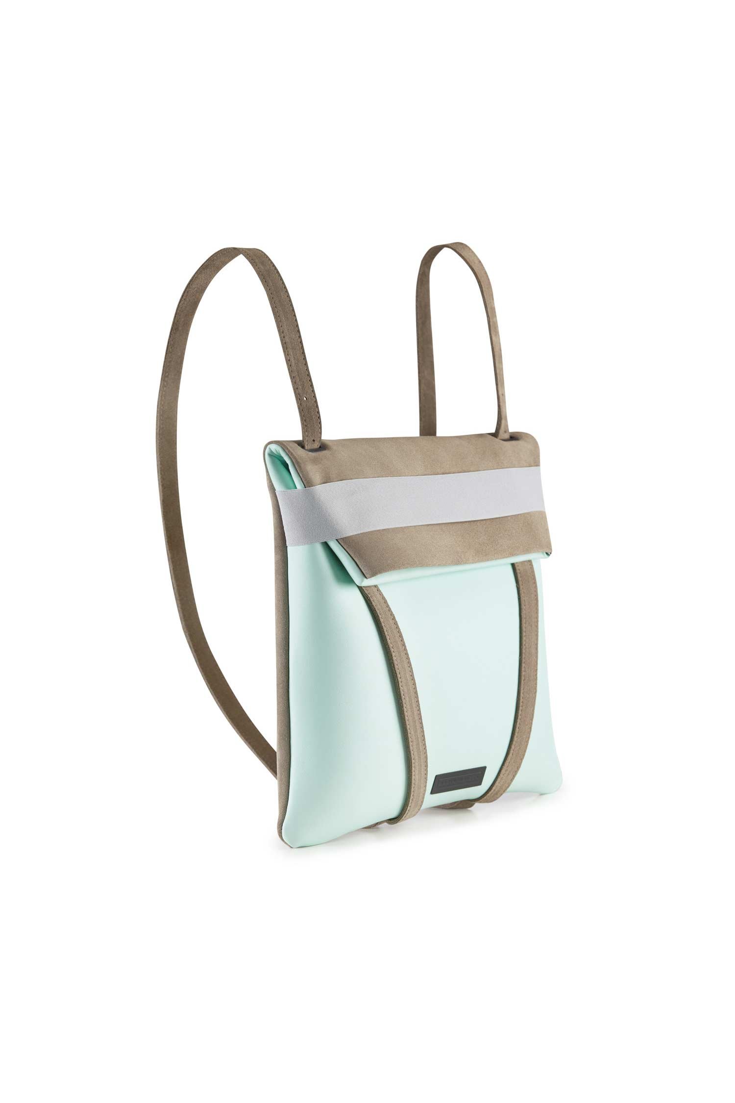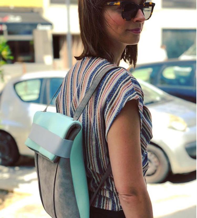 Backpack laptop bag in leather. Min blue and grey suede. Grey elastic and adjustable straps  70cm – 80cm. Two inner pockets. Dimensions:  35 x 33 cm. With an extra handle strap. REF. MMBPBT Made in Portugal