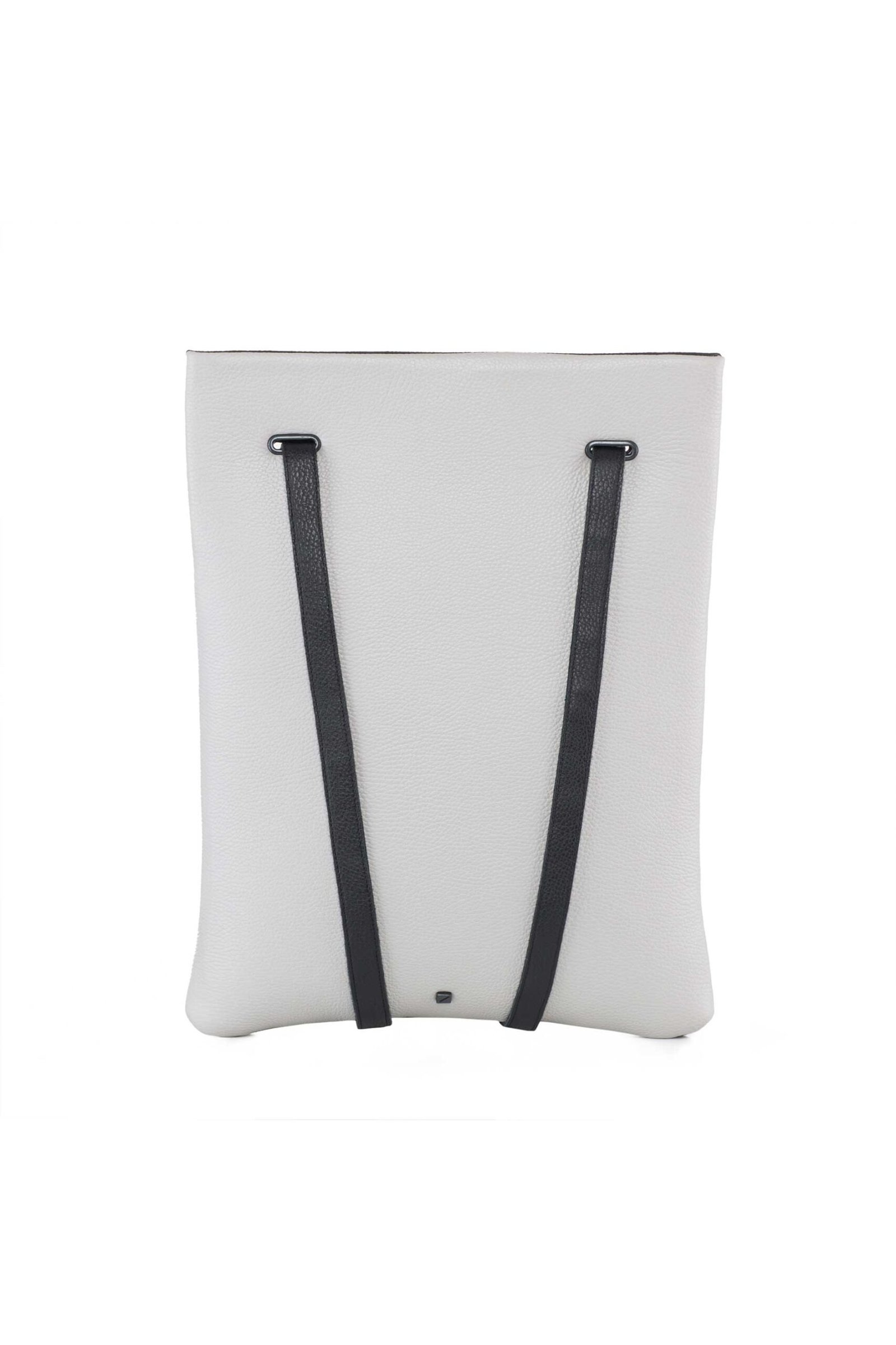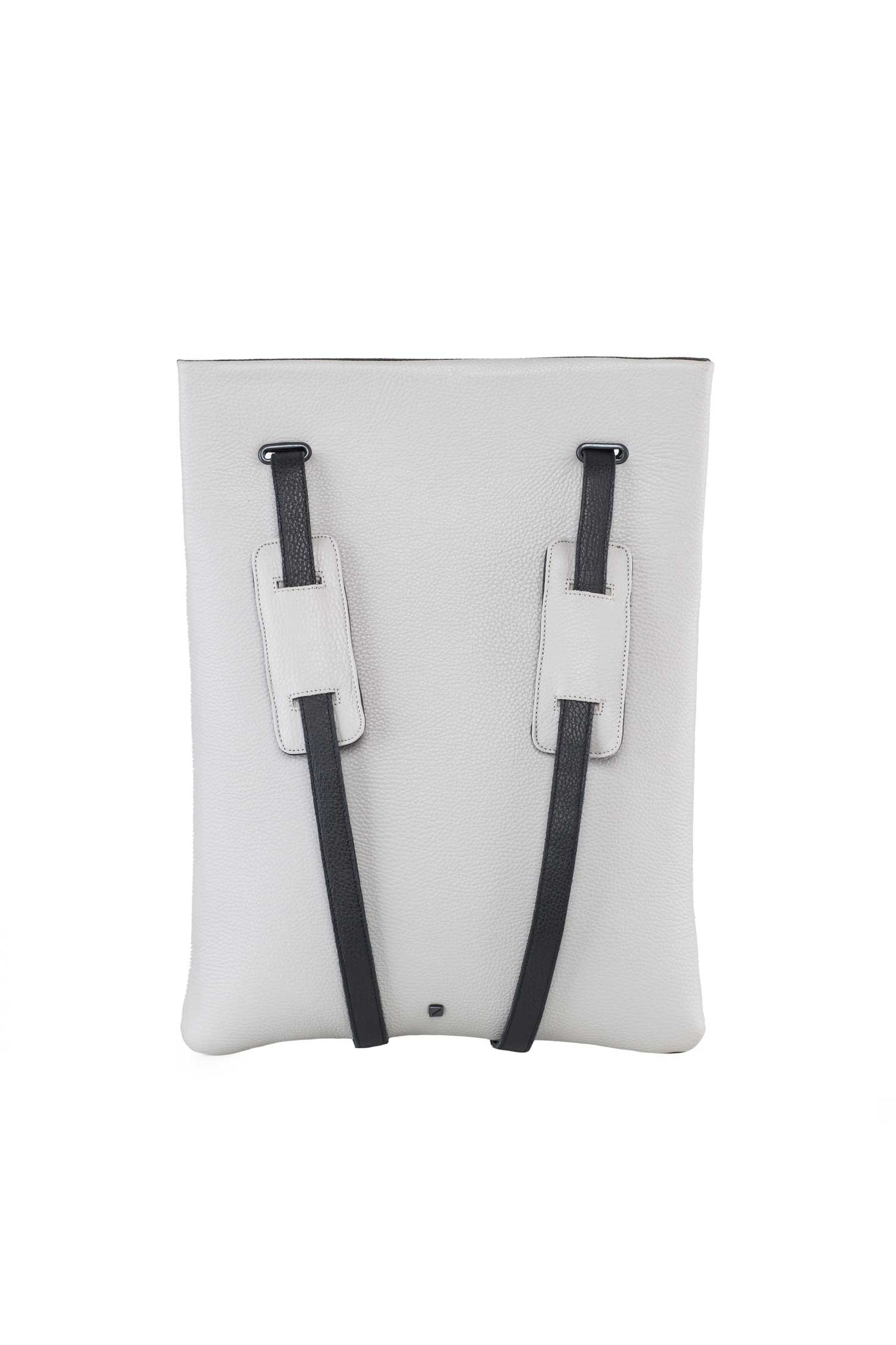 Black leather in one side. Back in light grey leather.  Adjustable straps 70cm to 90cm. One bigger inner pocket to your laptop with a velcro closer. Dimensions:  46 x 35 cm.  This backpack fits up to 15 laptop.  Made in Portugal REF. MMLPBG
