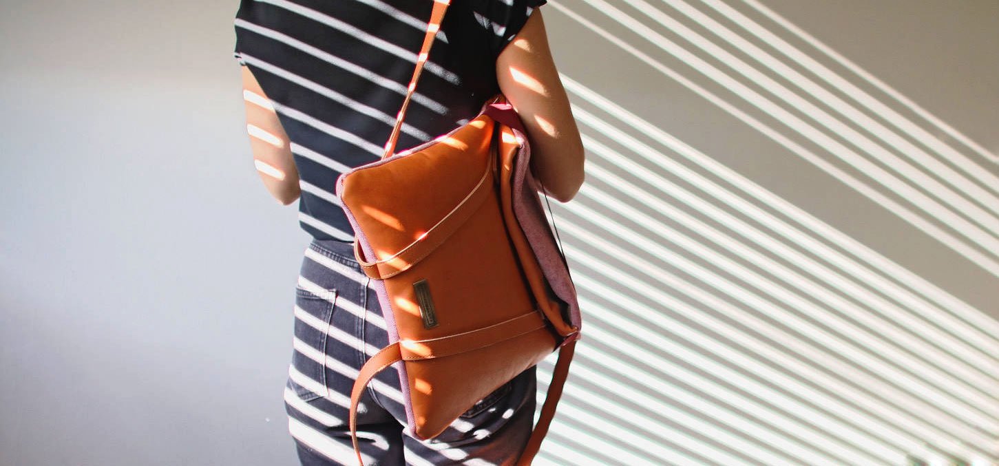 Women’s backpack. Orange camel premium sustainable metal-free tanned Leather. environmental-friendly. biodegradable and allergy-free. Back in light pink recycled cotton from PET bottles.  Bordeaux elastic. and adjustable straps. Two inner pockets.